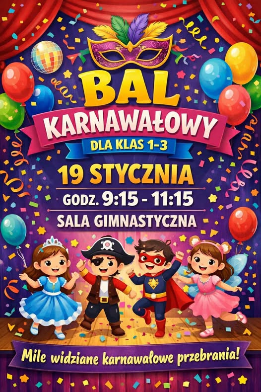 Bal karnawałowy dla klas I-III odbędzie się w dniu 19 stycznia w godzinach 9.15-11.15 w sali gimnastycznej.