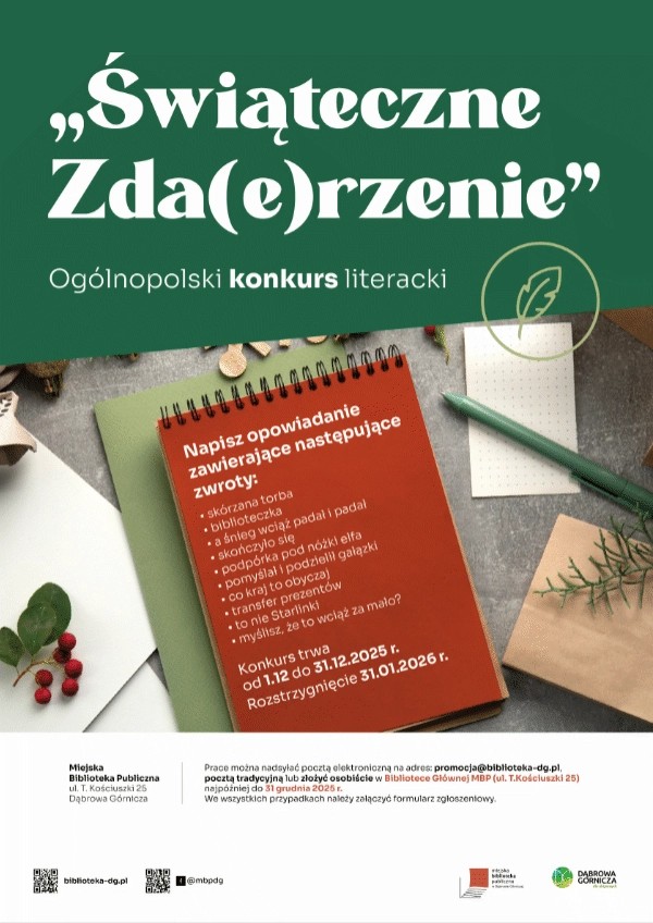 Zachęcamy do udziału w kolejnej edycji Ogólnopolskiego Konkursu Literackiego Świąteczne zda(e)rzenie. Organizatorem Konkursu jest Biblioteka Główna MBP w Dąbrowie Górniczej ul. T. Kościuszki 25.